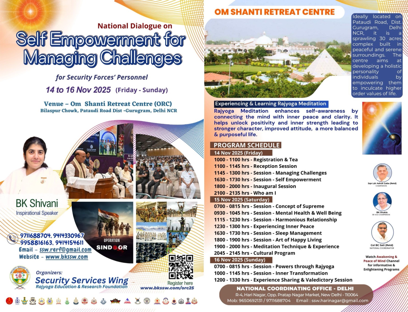 BK Shailendra (Mob Nos – 9414154646). WhatsApp No – 9414154611 - Delhi SSW Program Coordinating office is at Hari Nagar, Delhi Cantt. Point of Contact – BK Sarika Behn (9711688704) Email id – [email protected]
